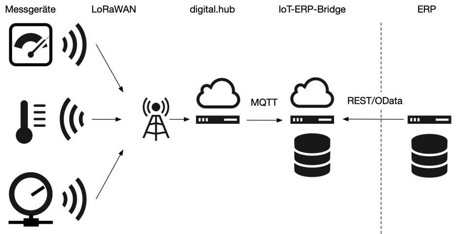 Abbildung: Anbindung eines ERP-Systems an die digital.hub-IoT-Plattform für LoRaWAN ausgelesene Zähler und Sensoren mittels der IoT-ERP-Bridge