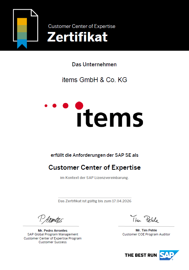 • regelmäßige Zertifizierungen des items-SAP-CCoE für eine professionelle Hilfestellung